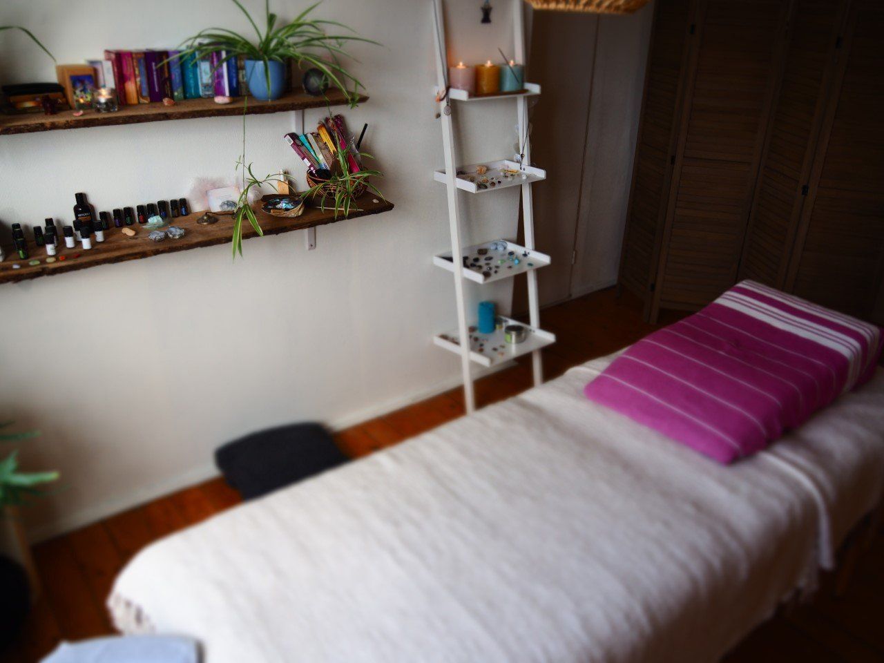Kom binnen in de ruimte waar het heerlijk warm is, je je veilig en geborgen voelt, waar oliën heerlijk door de ruimte geuren. Een zacht muziekje op de achtergrond klinkt.